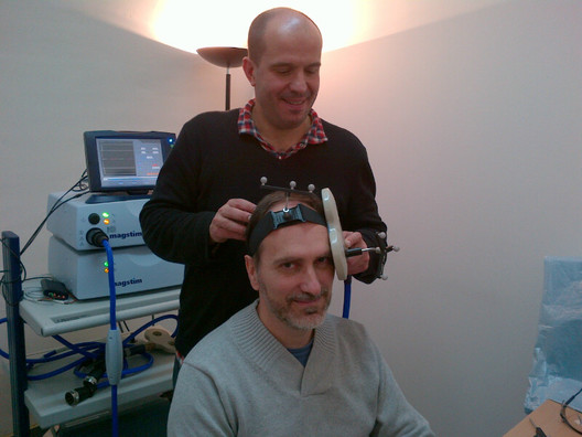 Below is a picture of Antoni Valero Cabre zapping stimulating my Broca's area using transcranianial magnetic stimulation.