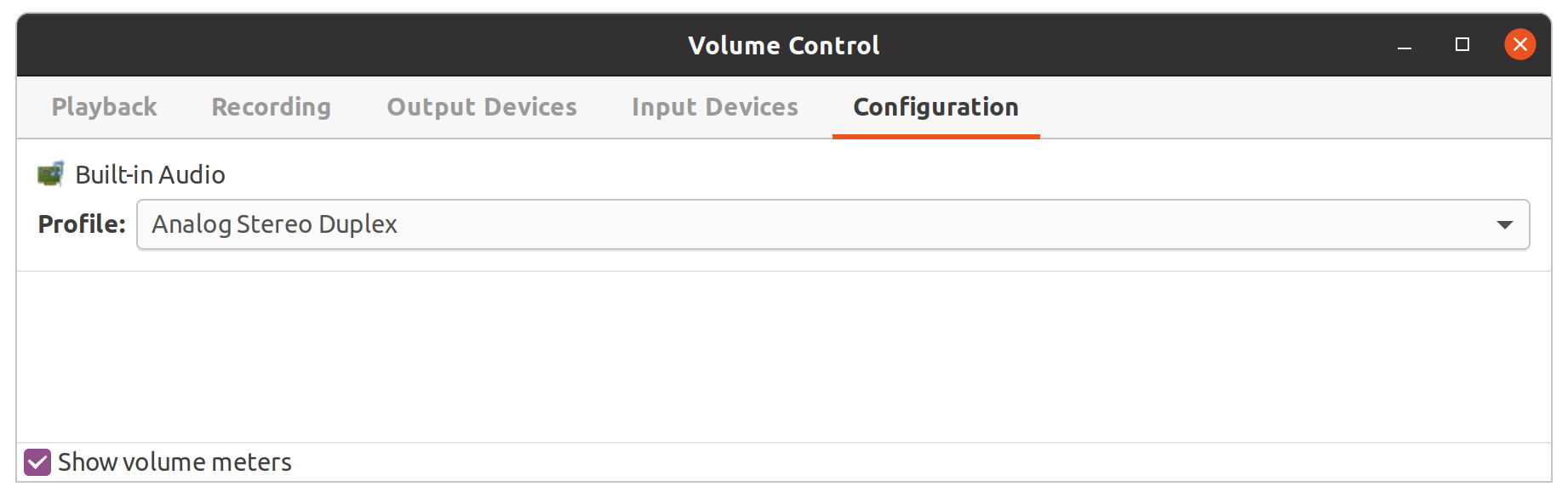Configurationtab, underBuilt-in audio, select `Analog Stereo Duplex``
